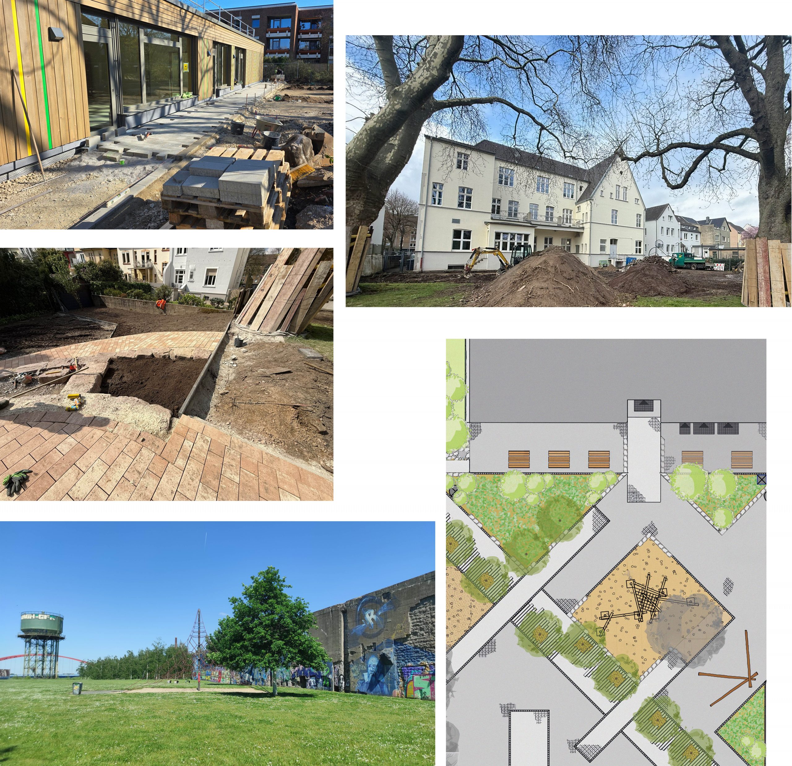 (1) Derzeit laufen die Arbeiten an den Außenanlagen am Erweiterungsgebäude der Herbert-Karrenberg-Schule, einer Förderschule in Neuss mit dem Förderschwerpunkt Lernen. Gerade entsteht der Weg ums Gebäude sowie ein Grünes Klassenzimmer.