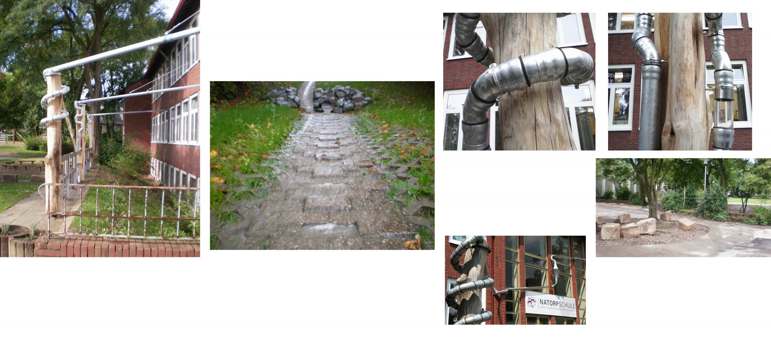 Alle Dach- und Hofflächen – insgesamt etwa 12.500 m² – wurden an den Schulen vom Mischwassersystem abgekoppelt. Über offene Rinnen und neue Grundleitungen wird das anfallende Regenwasser in Retentionsmulden und weiter nun in einen Siepen geleitet.
